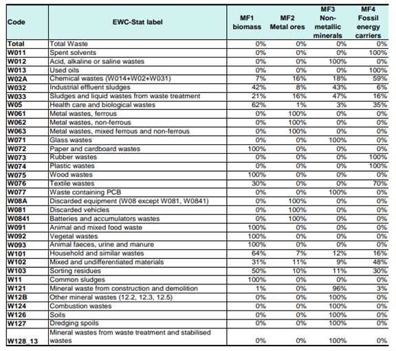 As waste data are not usually reported by material flow, it is necessary to establish a correspondence between waste categories and the four main material flow categories. The following table shows the correspondence factors proposed by Eurostat.