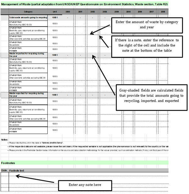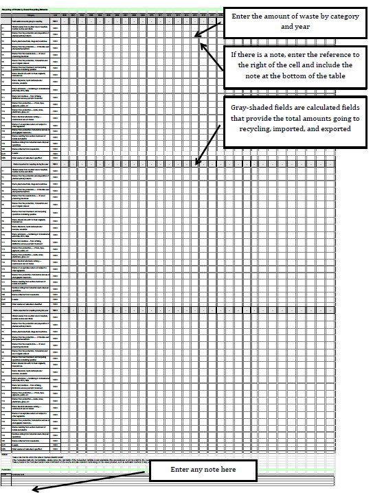 Use the Waste recycled tab to provide information on amounts of waste going to recycling, and imported or exported for recycling each year in groupings used in the UNSD/UNEP questionnaire (Figure 2. 9). For Basel Convention groupings, use the Waste recycled Basel tab (Figure 2. 10) (Refer to indicator National Recycling Rate).
