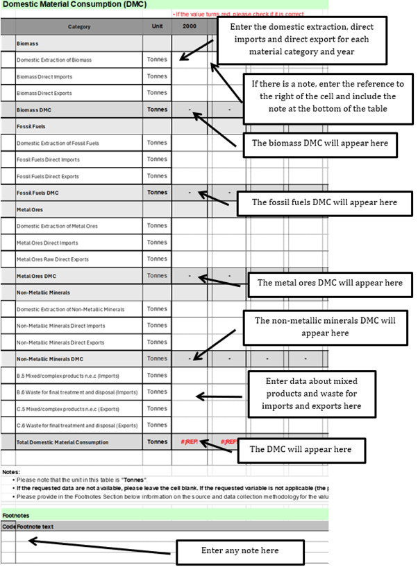 Enter the data of domestic extraction, direct imports and direct exports for each material category and the DMC by material category and the total will be calculated automatically.