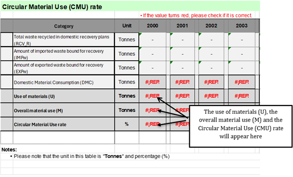 As the sheets are linked together, the amount of waste recycled in domestic recovery plants and the amount imported and exported for recovery for each year inserted previously in the CMU rate tab of the workbook will appear in the CMU tab, as well as the DMC value for each year from the DMC tab. The use of materials (U), the overall material use (M) and the CMU rates will be calculated automatically.