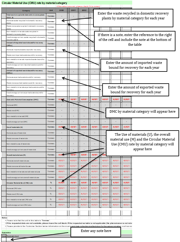 In case data for each material category are available, enter data in the CMU rate by material tab. Users will insert data on waste recycled in domestic recovery plants by material category, and the waste imported and exported bound for recovery by material category. The CMU tab will get the DMC value for each material category and each year from the DMC tab. The tab is embedded with formulae that will automatically calculate the use of materials (U) by material category, the overall material use (M) by material category and the CMU rate by material category.