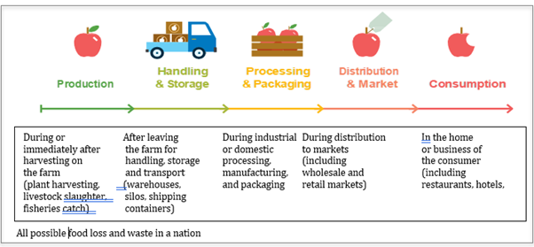 “Food loss is defined as all the crop and livestock human-edible commodity quantities that, directly or indirectly, completely exit the post-harvest/slaughter production/supply chain by being discarded, incinerated or otherwise, and do not reenter in any other utilization (such as animal feed, industrial use, etc.), up to, and excluding, the retail level. Losses that occur during storage, transport and processing, also of imported quantities, are therefore all included. Losses include the commodity as a whole with its non-edible parts decrease in edible mass at the production, post-harvest and processing stages of the food chain” (Food and Agriculture Organisation of the United Nations 2022).