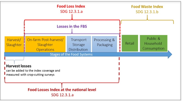 SDG target 12.3 aims to halve per capita global food waste at the retail and consumer levels and reduce food losses along production and supply chains, including post-harvest losses. Indicator 12.3.1 comprises two sub-indicators: 12.3.1a Food loss index and 12.3.1b Food waste index. The two sub-indicators cover discrete food value chain stages, but some overlap is possible at the interface of the manufacturing and retail stages (see Figure 2.14). Indicator 12.3.1a Food loss index has two sub-indicators, (a) Food loss index and (b) Food loss percentage.