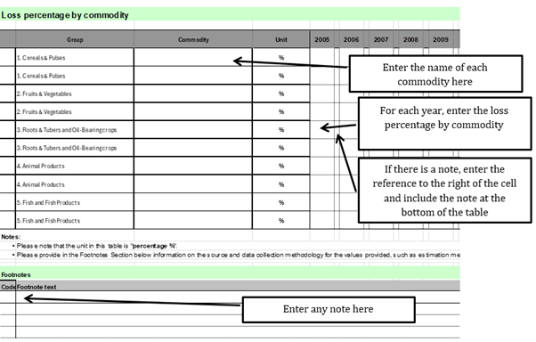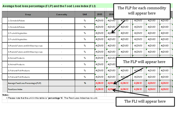 There are three tabs that have to be used to calculate the Food Loss Index. The loss percentage by commodity tab of the workbook needs to be populated with the name of the chosen commodities for each group and the estimated loss percentage as previously described.