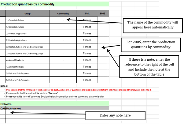 Next, in the production quantities by commodity tab, users will enter data on production quantities for each commodity for 2005 (base year fixed by the FAO). The name of each commodity will automatically appear.