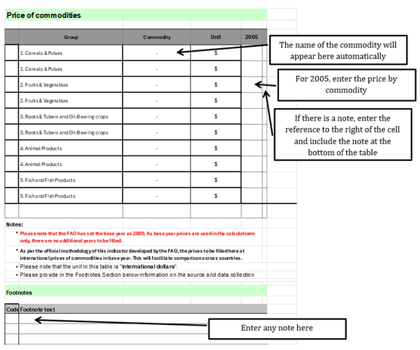 Finally, users will insert data in the price of commodities tab. The price for 2005 (base year fixed by the FAO) can be entered in the local currency or in international dollars. In the first case, only national comparisons will be possible while in the second case comparisons at an international level will allow for better analysis of the country situation regarding food loss.