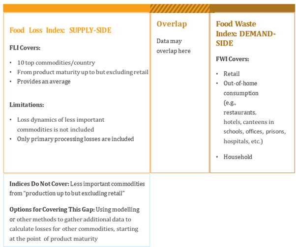 Regarding indicator’s scope, the index scope was reduced for international comparability purposes to exclude harvest losses, which are critical at the production stage. Moreover, the index covers only two commodities in each food group, because requesting regular loss data for a larger number of products would be a difficult and unsustainable exercise for most countries. The index monitors only quantitative losses. Qualitative and economic losses that are also very relevant but not measurable in a consistent manner are out of the scope of the indicator.