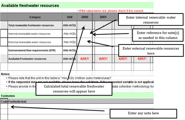 It is recommended to use the AQUASTAT questionnaires and the AQUASTAT water resources templates to collect the data required for the computation of the indicator. That will allow to upload directly the data into the AQUASTAT database, as appropriate since FAO is the custodian agency for the indicator. As an alternative, the tables presented in SEEA-Water can be used.
