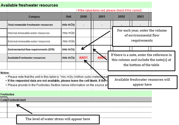 The indicator can be populated with estimations based on national data aggregated to the country level. If needed, data can be retrieved from internationally available databases on water availability and withdrawals by different sectors. Inclusion of estimation of environmental flows requirements based on literature values.