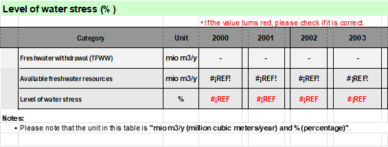 The level of water stress tab of the workbook will then display the results based on the data input in the other worksheets. This is done automatically to facilitate the calculations of the indicator.