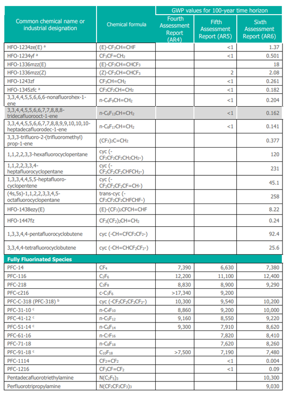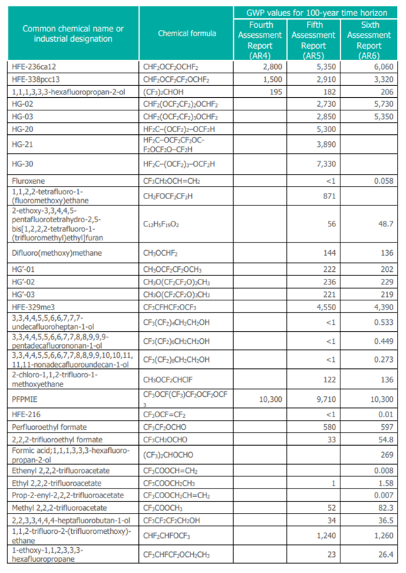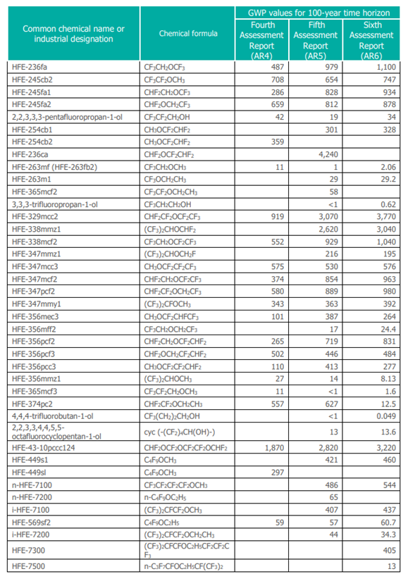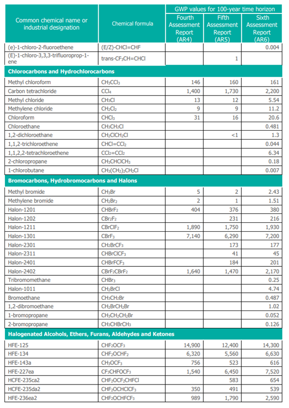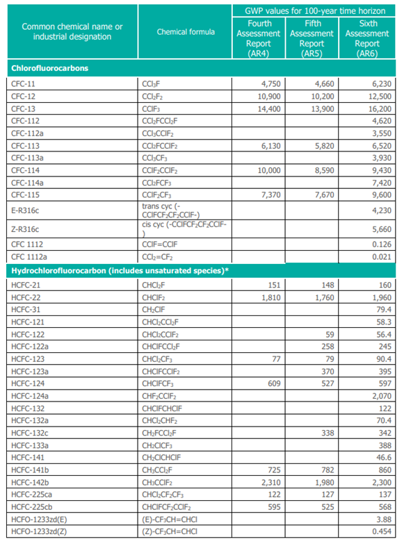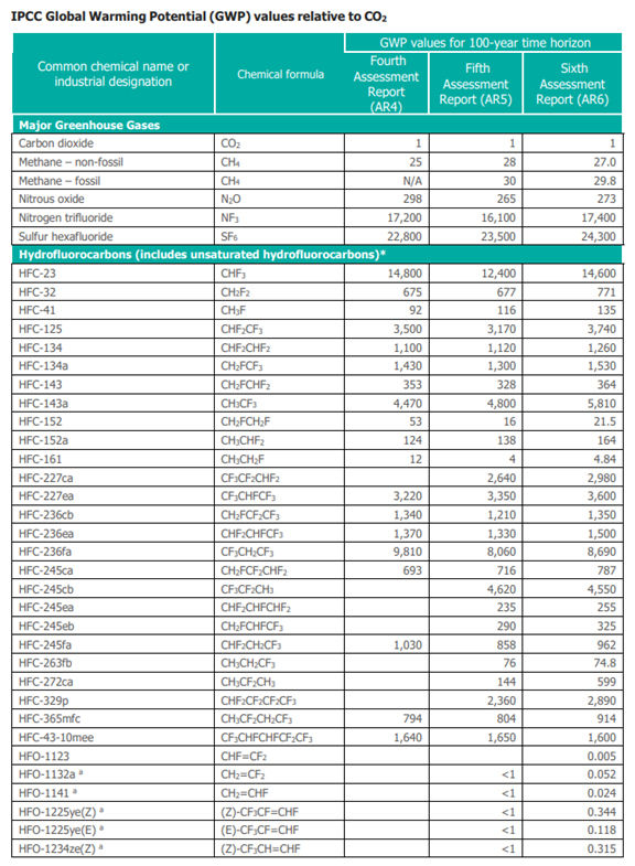 This annex provides 100-year time horizon global warming potential (GWP) values from the Intergovernmental Panel on Climate Change (IPCC). The table below is adapted from the IPCC Sixth Assessment Report, 2020 (AR6)
