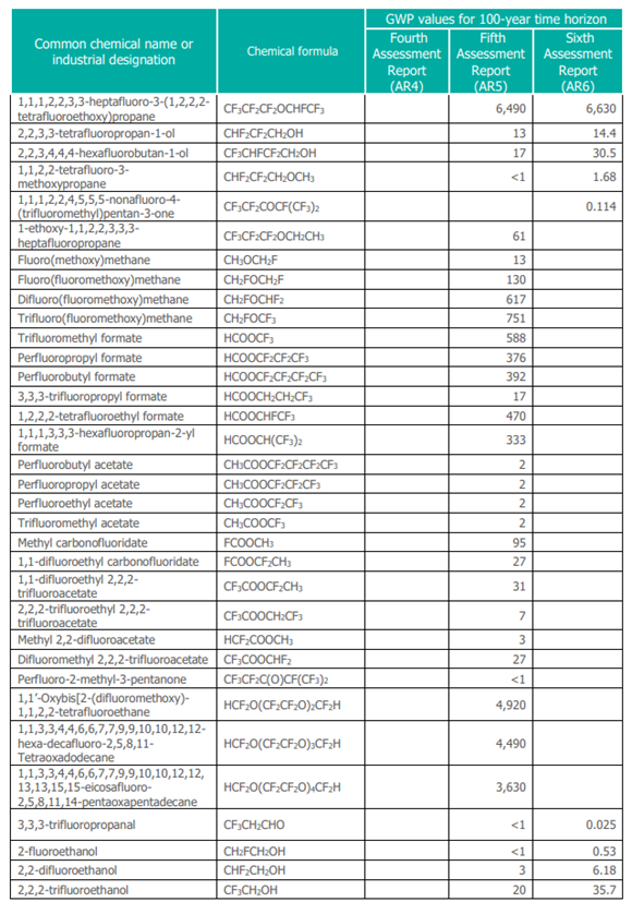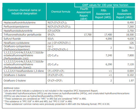 The AR6 values are the most recent, but the Fourth Assessment Report (2007) and Fifth Assessment Report (2014) values are also provided because they are sometimes used for inventory and reporting purposes. The use of the latest values (AR6) is recommended. IPCC also publishes 20-year and 500-year time horizon GWPs but these are not included in this annex. For more information, refer to the original IPCC data sources: