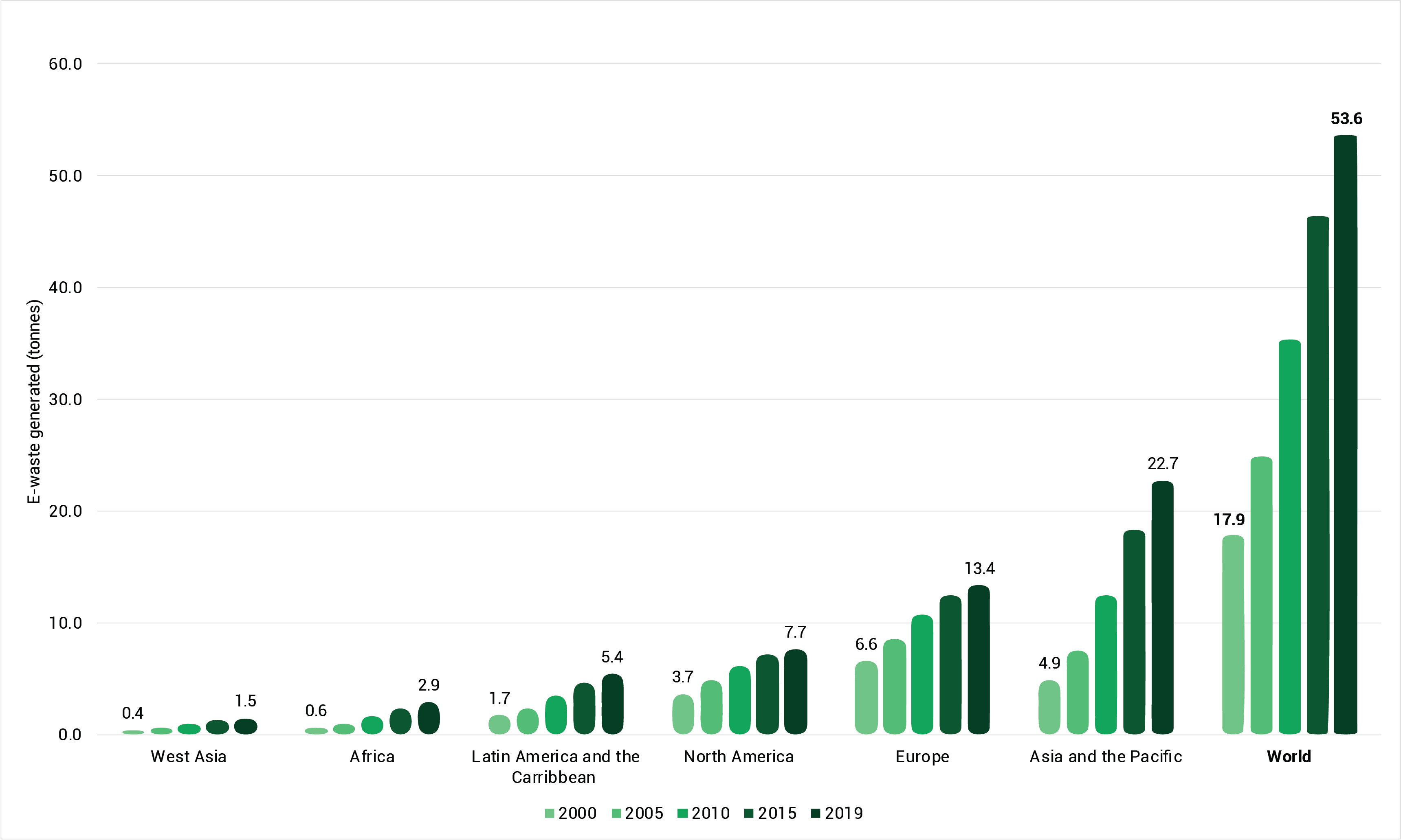Global e-waste generation per person almost tripled between 2000 and 2019 (from 17.9 million tons to 53.6 MT). All regions show similar trends, with the greatest increase (in percentage and total amount generated) in Asia and the Pacific, which accounted for more than 40 per cent of e-waste generated in 2019 followed by Europe and North America (25 and 14 per cent, respectively). Africa accounted for only around 5 per cent of the total, although its e-waste generation rate increased almost five-fold during this period. E-waste generation in the regions and globally is expected to continue to rise during the next few years, with an expected volume generated of 75 MT by 2030 (Forti et al. 2020).