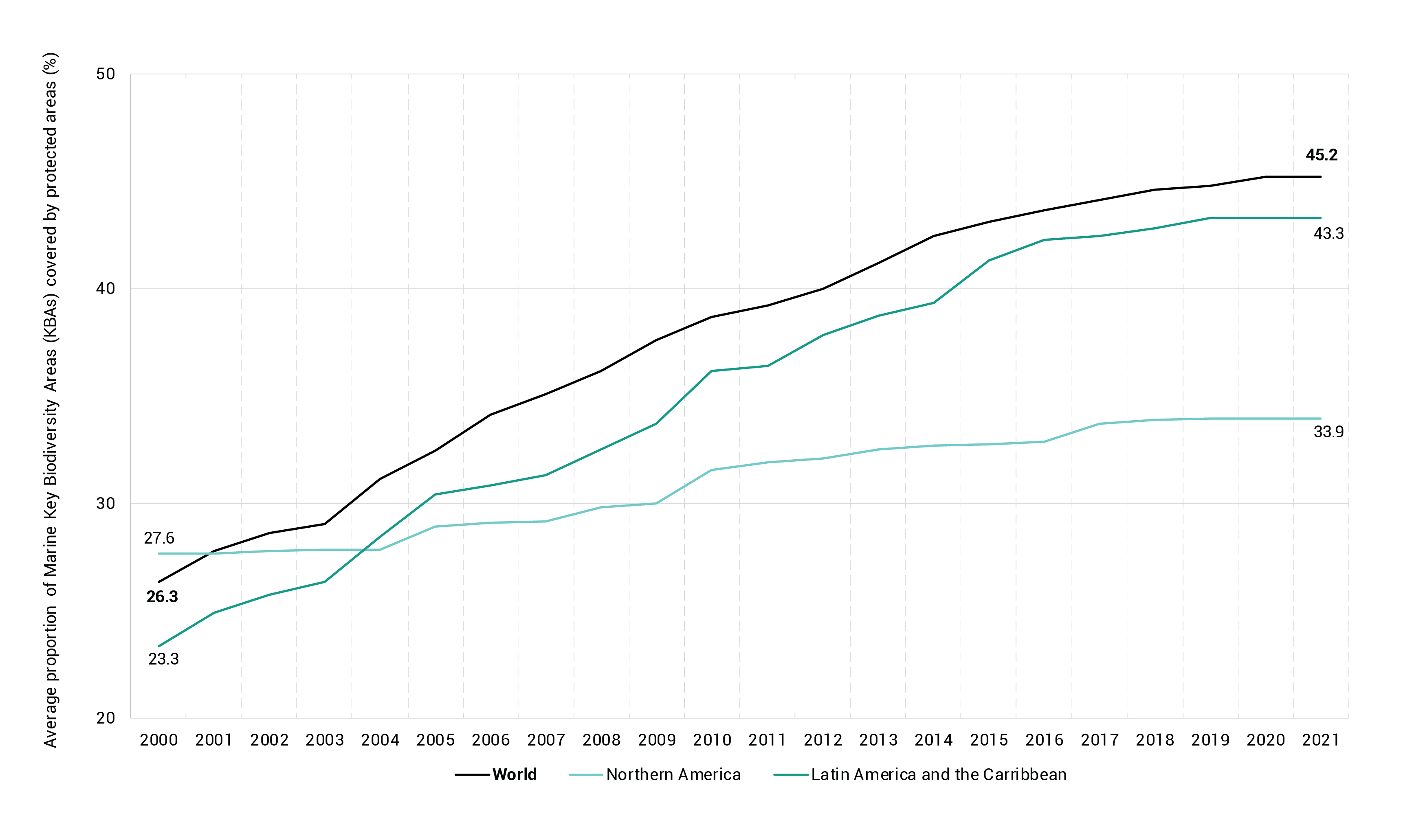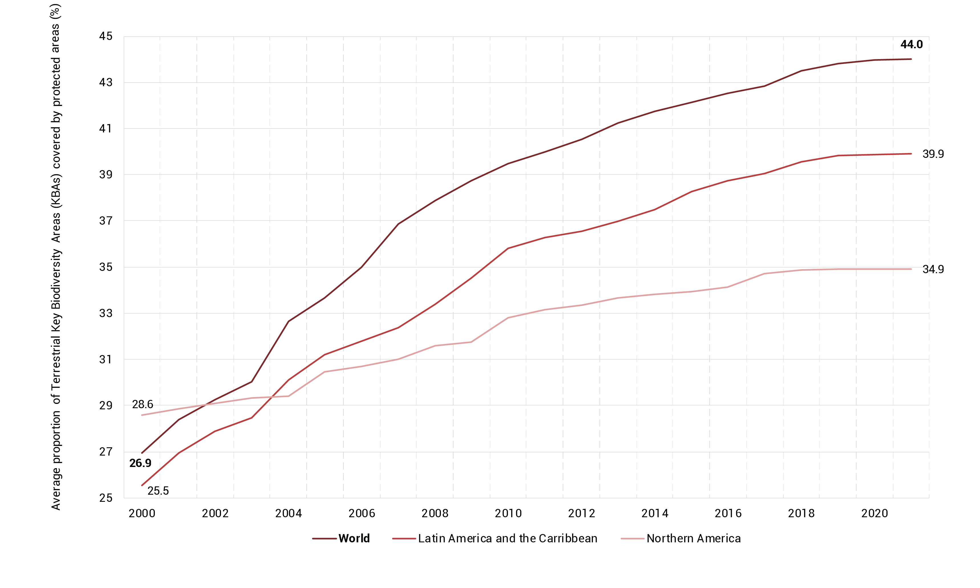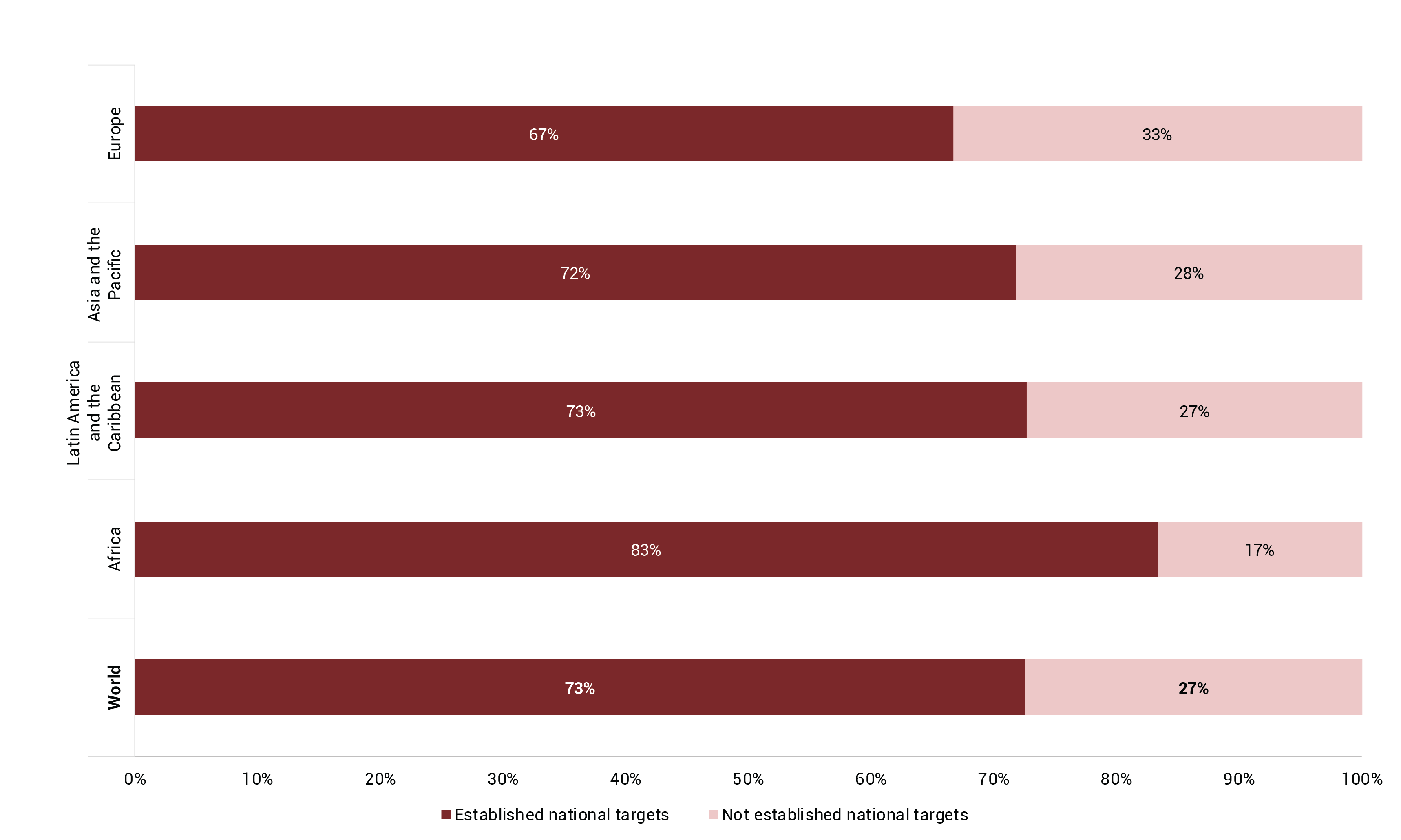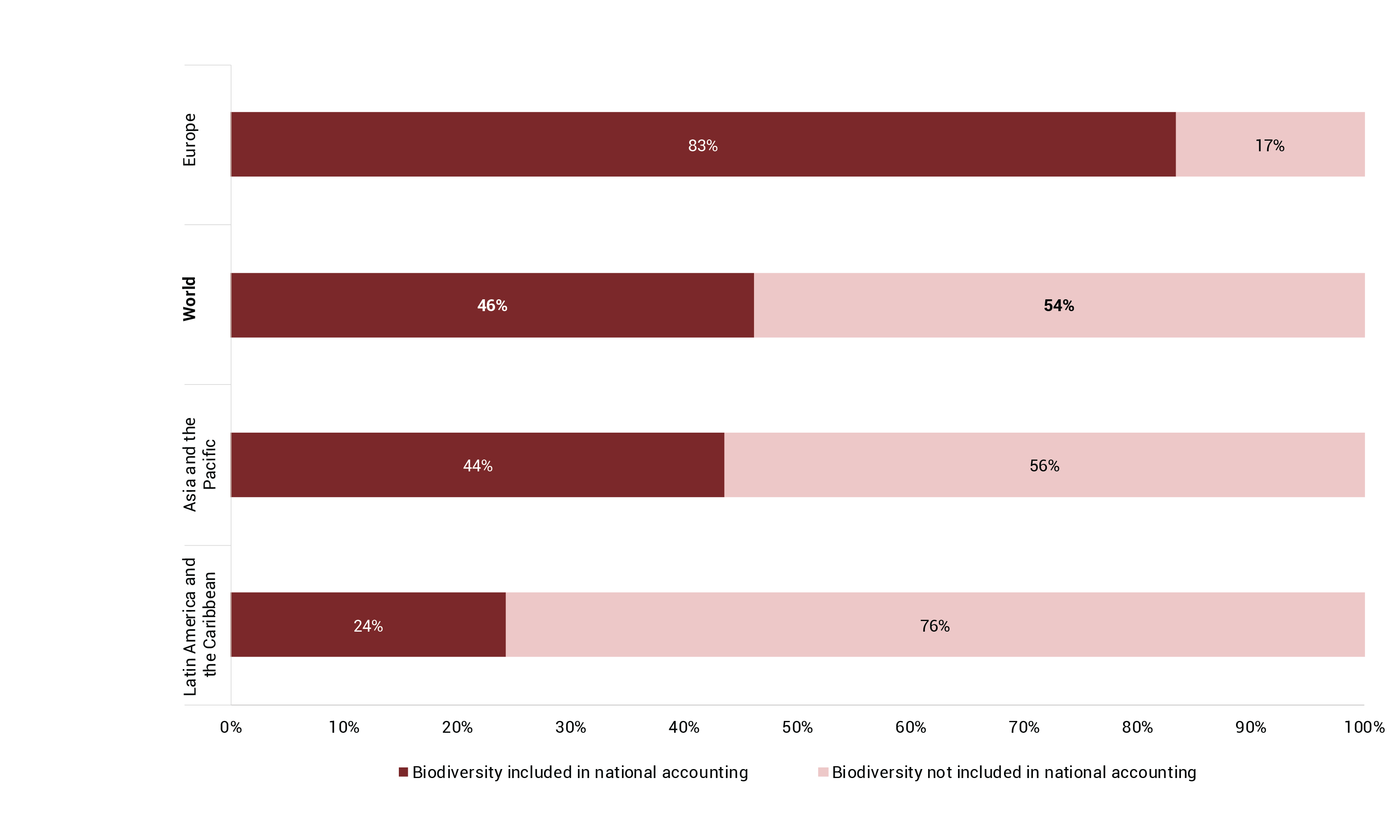 In 46 per cent of the countries in the world biodiversity is integrated into national accounting and reporting systems, defined as implementation of the System of Environmental-Economic Accounting (SEEA). This means that more than half (54 per cent) have not mainstreamed biodiversity into their national accounting and reporting systems. By far the highest compliance rates can be found in Europe (83 per cent), followed by Asia and the Pacific (44 per cent) and Latin America and the Caribbean (24 per cent). Data for North America were insufficient for inclusion in the analysis.