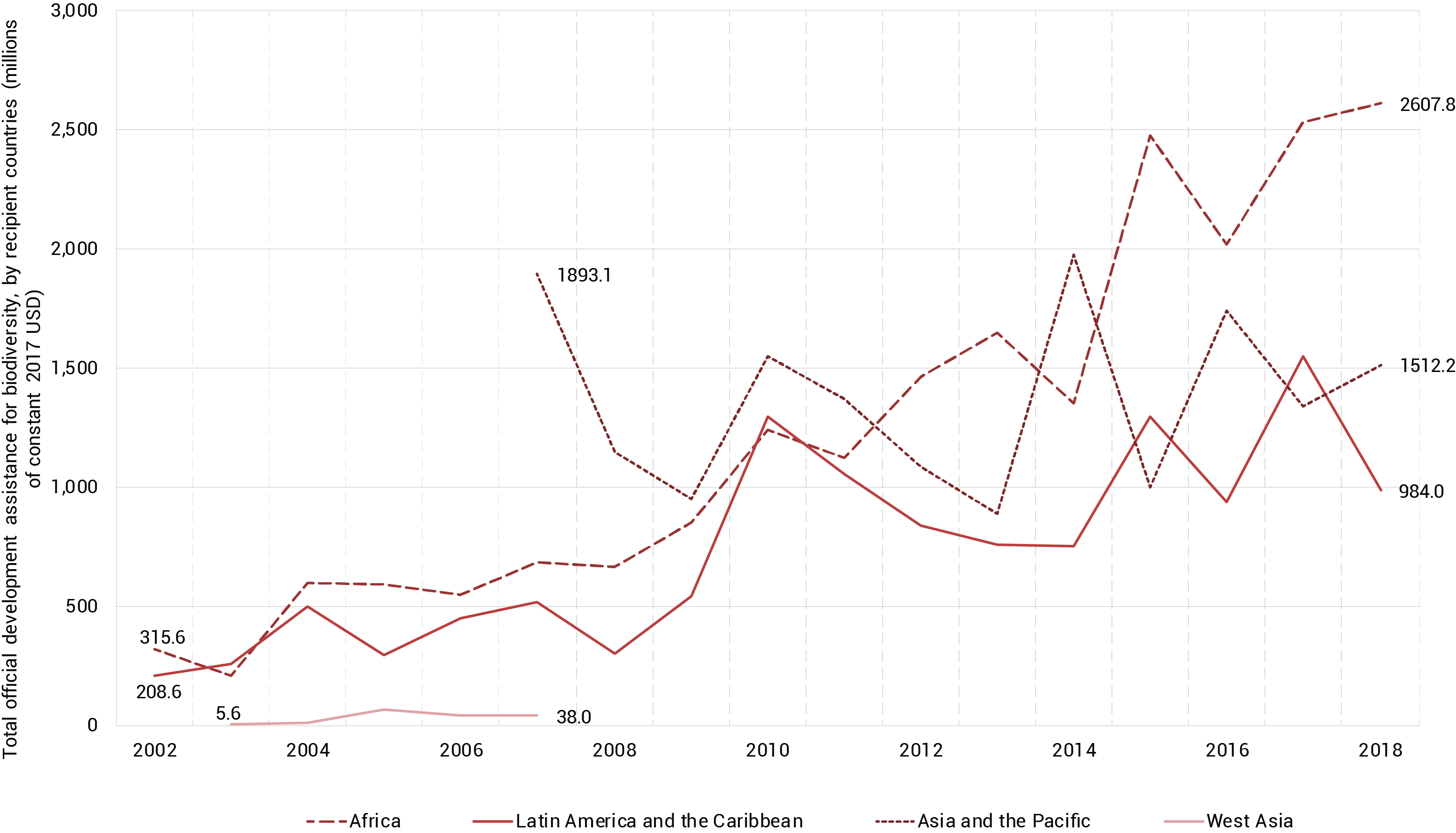 Globally, total ODA for conservation and sustainable use of biodiversity showed fluctuating trends with overall increases during the past two decades. In Africa ODA flows increased sharply between 2002 and 2018, when they totaled more than US$ 2.5 billion.