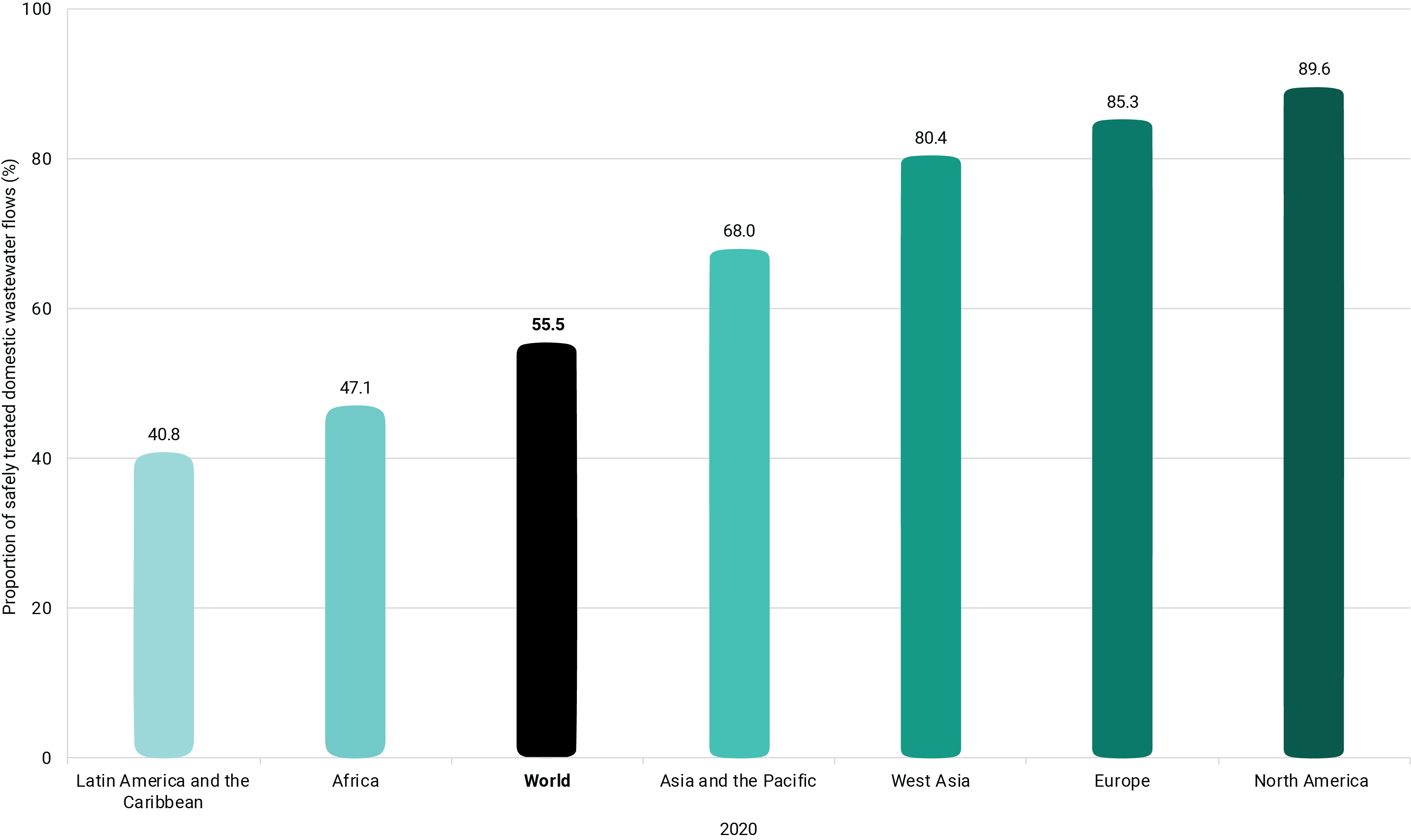 Globally in 2020, only around 55 per cent of domestic and industrial wastewater was considered to be safely treated. In North America almost 90 per cent was considered to be safely treated, followed by Europe at about 85 per cent. The lowest values were observed in Latin America and the Caribbean and in Africa (around 41 per cent and around 47 per cent, respectively).