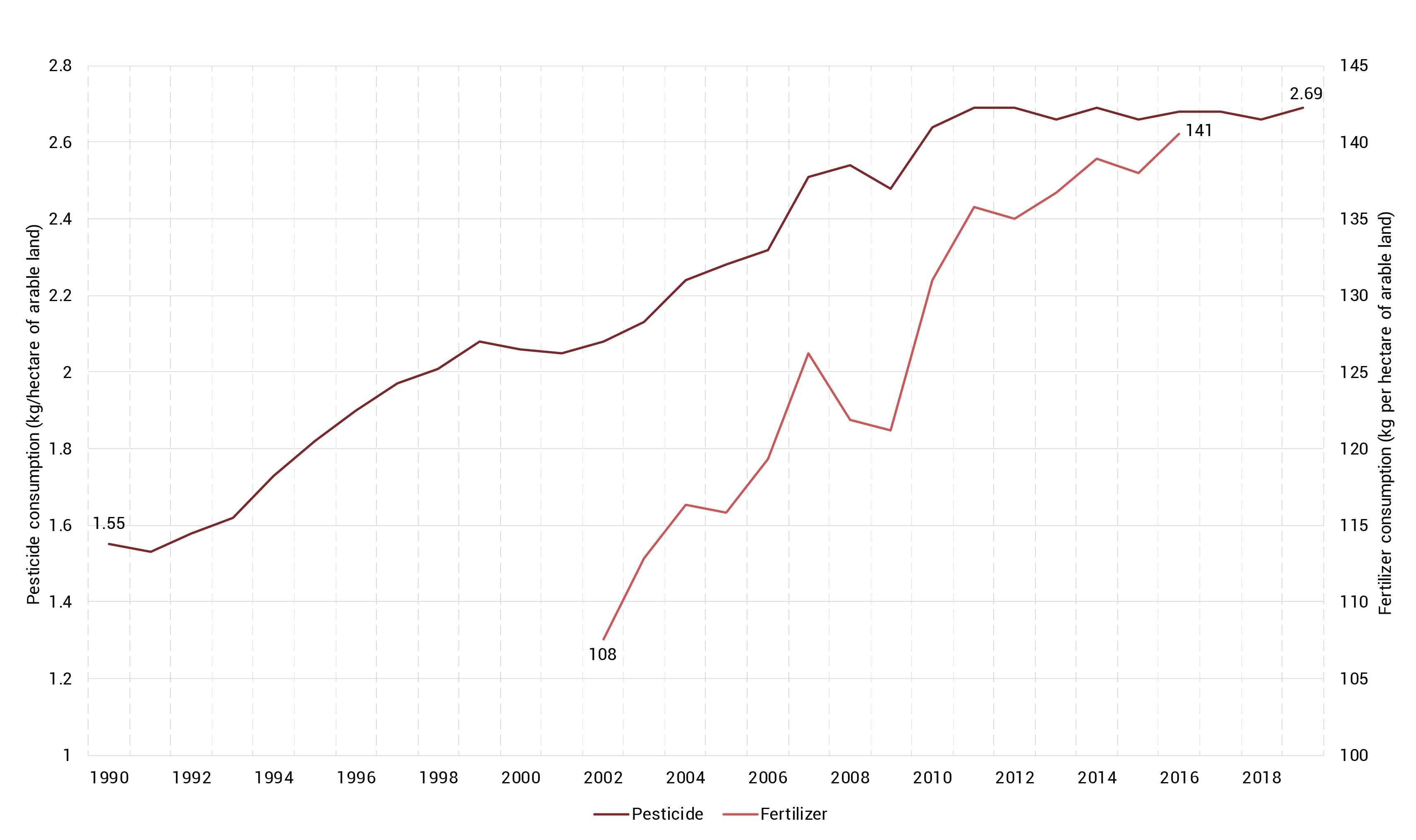 Domestic material consumption (DMC), like the material footprint (MF), measures materials flows and indicates the total amount of materials directly used by an economy for its production processes. The indicator measures potential environmental pressures on domestic territory, as it covers all material flows entering an economy that are eventually emitted back to the domestic environment as waste and emissions (Giljum, Bruckner and Martinez 2015). Manufacturing waste can be non-hazardous (solid, liquid and gaseous) or hazardous, with flammable, corrosive, active and toxic characteristics, causing significant pollution of the environment (Millati et al. 2019). As waste management is relatively limited in many countries, waste in these countries ends up being disposed in the environment with significant health and environmental impacts.