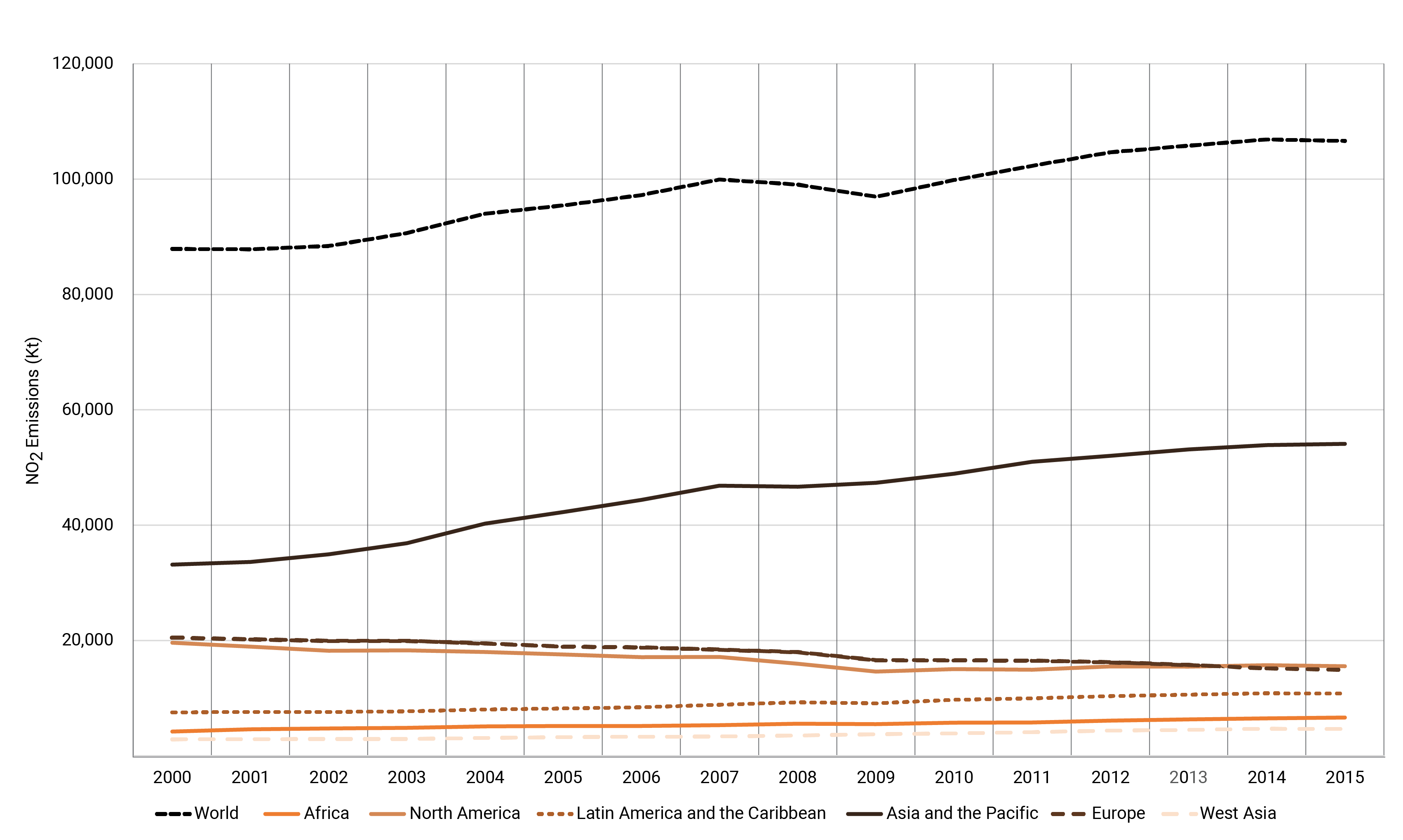 Global emissions of nitrogen oxides (i.e. nitrogen dioxide [NO2] and nitric oxide [NO], which is oxidized in the atmosphere to become NO2) increased moderately between 2000 and 2015. The highest emission levels were in Asia and the Pacific, reflecting economic growth and urbanization.