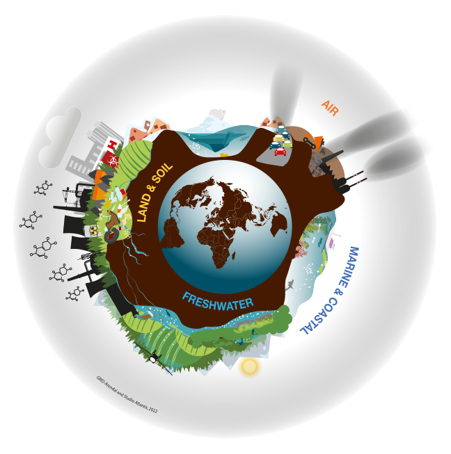 Hazardous chemicals used in mining include cyanide, sulphuric acid and mercury (The World Counts 2023b); ammonium nitrate may be used to blast tunnels and acetylene for welding and soldering (Baekken 2014; Hesperian Health Guides 2020). Human exposure to small particles from mining (e.g. dust, uranium, iron, lead, zinc, silicon, titanium, sulphur, nitrogen, platinum, chromium, vanadium, manganese and mercury) constitutes a major health risk (UNEP 2017d; Lucas da Silva-Rêgo, Augusto de Almeida and Gasparotto 2022). Growing material footprints and rates of domestic consumption are associated with increased production and use of chemicals and generation of waste. The planetary boundary for novel entities (i.e. the boundary related to environmental pollutants and other “novel entities” including plastics) has not been quantified, but it may have been exceeded as annual production and releases have been increasing at a pace that outstrips the global capacity for assessment and monitoring (Persson et al. 2022; Stockholm Resilience Centre 2022).