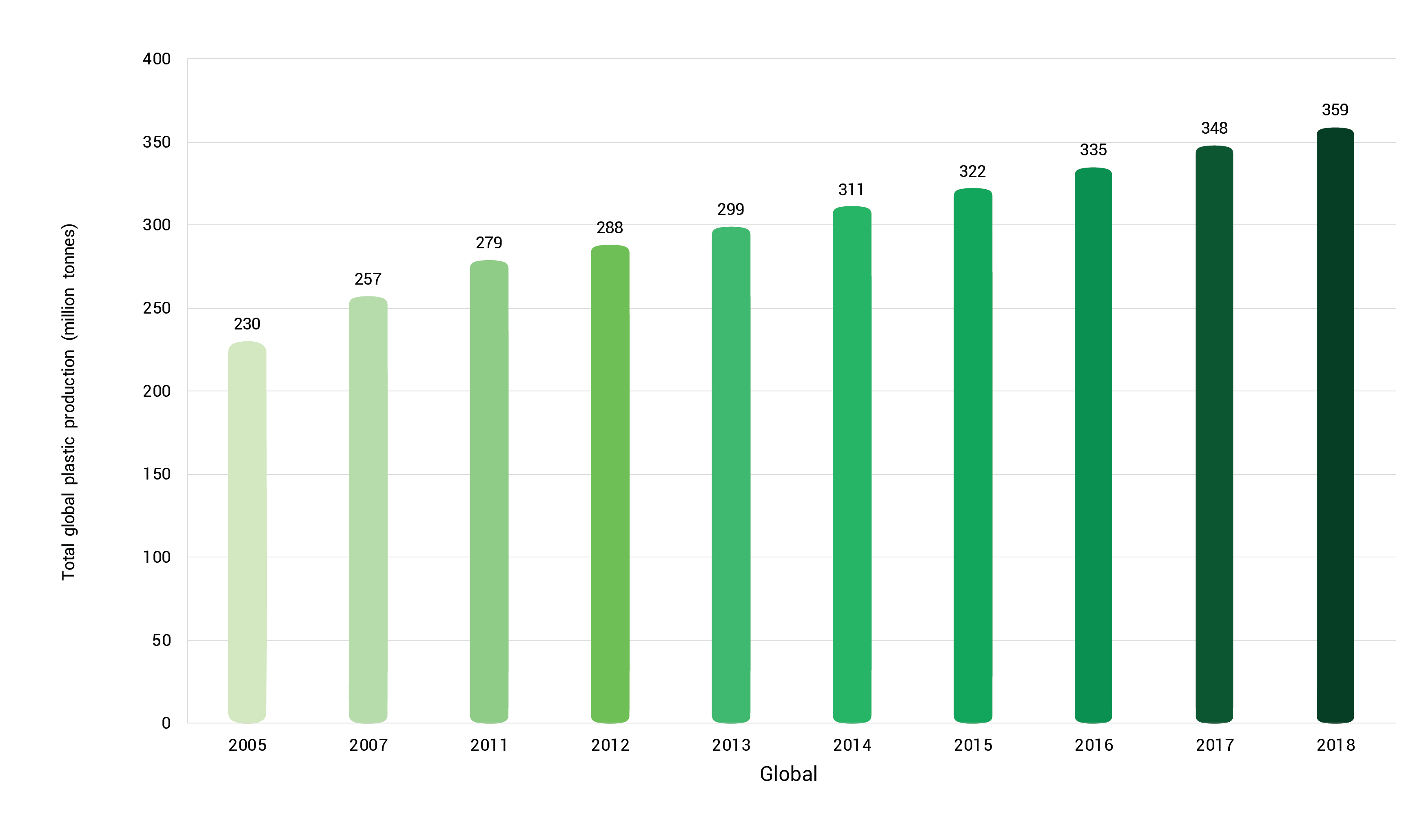 In 1950 around 2 MT of plastics were produced in the world. Since then annual plastics production has increased nearly 200-fold, reaching an estimated 359 million tons in 2018. Between 2005 and 2018 the amount of plastics produced globally increased by more than 50 per cent.