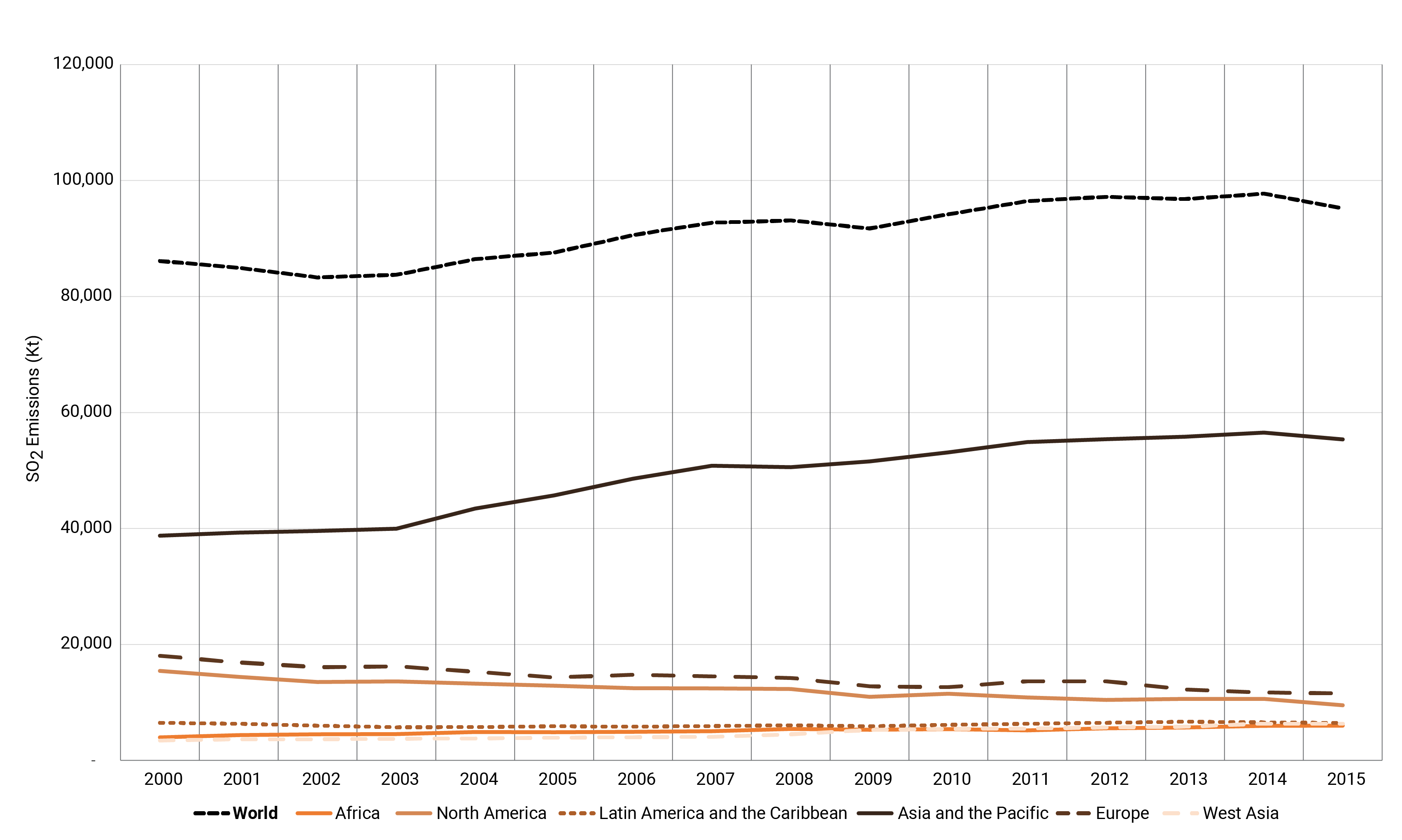 Global SO2 emissions increased between 2000 and 2014, after which they started to decline. Lower emission rates can be attributed to sulphur emission controls in the energy sector, especially in developing countries in Asia. SO2 emissions in Asia and the Pacific were higher than in other regions owing to the use of coal-based energy sources in the growing industrial sector. However, countries in this region, including China and Japan, have put into effect measures such as desulphurization technology, reduction of industrial coal use, and power sector reforms (UNEP 2019a).